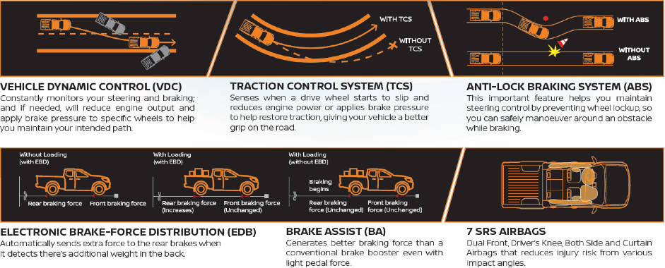 Standard safety features includes Anti-Lock Braking System (ABS), Electronic Brake-force Distribution (EBD), Brake Assist (BA) and Traction Control System (TCS). The Vehicle Dynamic Control (VDC) system helps improve 4x4 driving performance and safety, along with Active Brake Limited Slip (ABLS), Hill Start Assist (HSA) and Hill Descent Control (HDC). When it comes to Nissan, it's always Safety First.